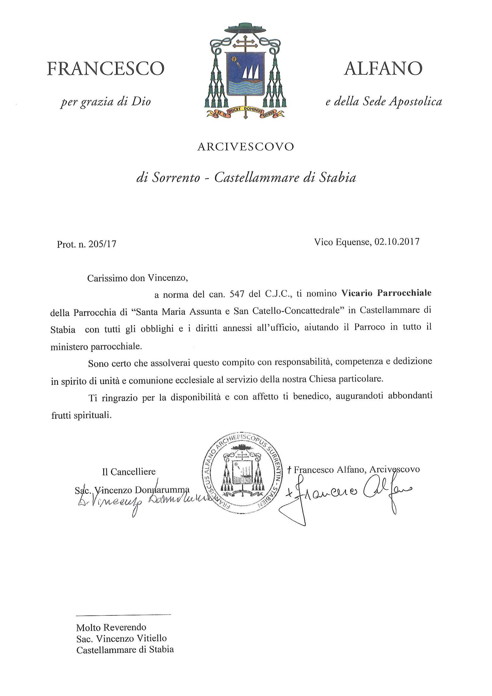 Don Vincenzo Vitiello, in data 2 ottobre 2017, è stato nominato Vicario Parrochiale della parrocchia Santa Maria Assunta e San Catello (Concattedrale) in Castellammare di Stabia.