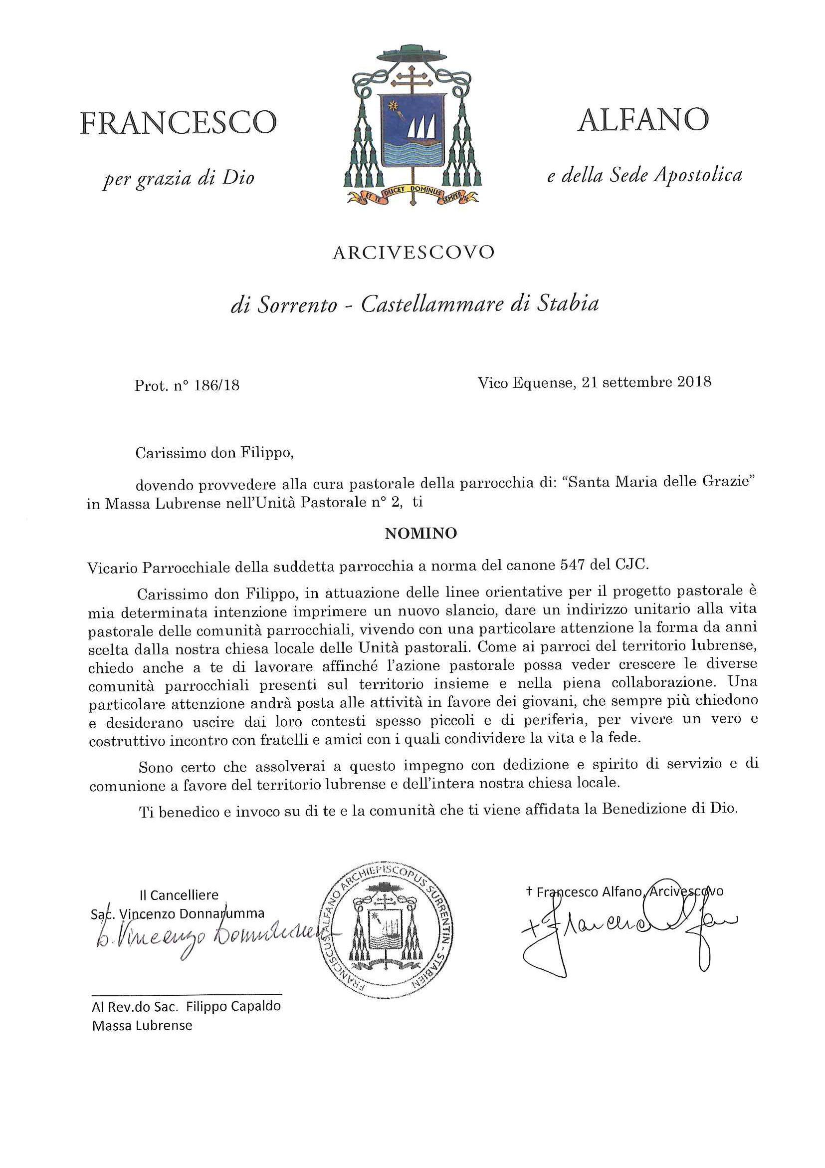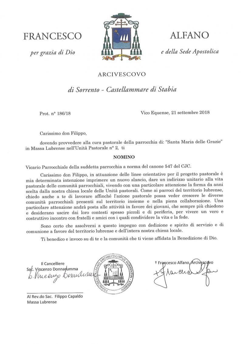 Don Filippo Capaldo, in data 21 settembre 2018, è stato nominato Vicario Parrocchiale presso la Parrocchia Santa Maria delle Grazie in Massa Lubrense.