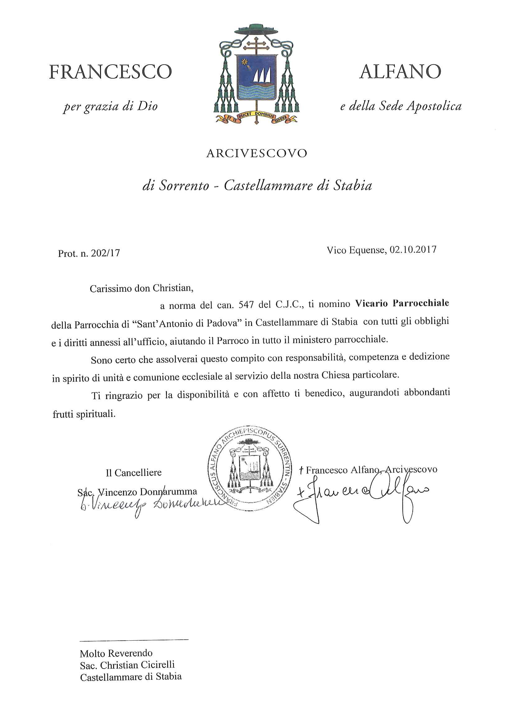Don Christian Cicirelli, in data 2 ottobre 2017, è stato nominato Vicario Parrochiale della parrocchia Sant’Antonio di Padova in Castellammare di Stabia.