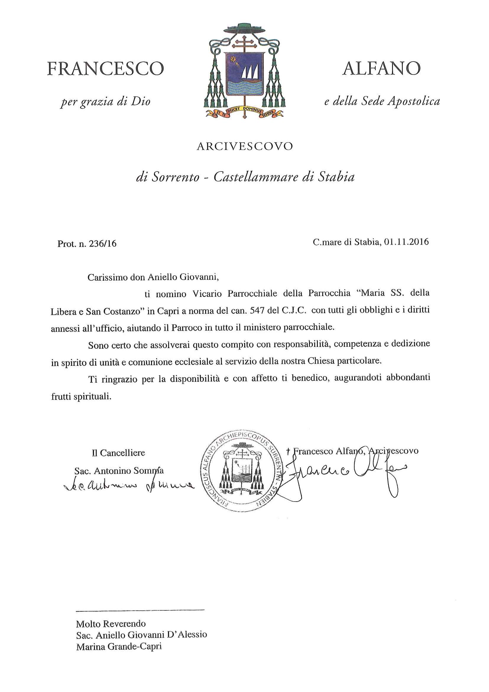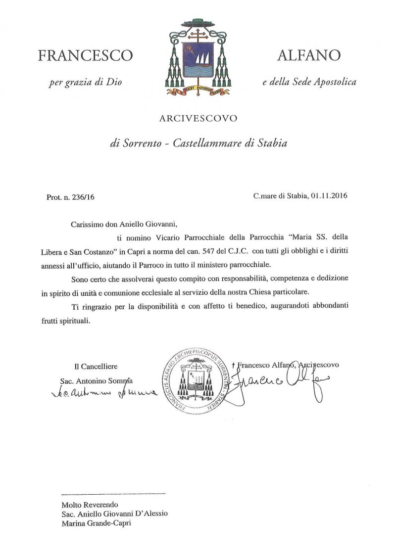 Don Aniello Giovanni d’Alessio, in data 1 novembre 2016, è stato nominato Vicario Parrochiale delle parrocchie Santo Stefano Protomartire e Maria SS. della Libera e San Costanzo in Capri.