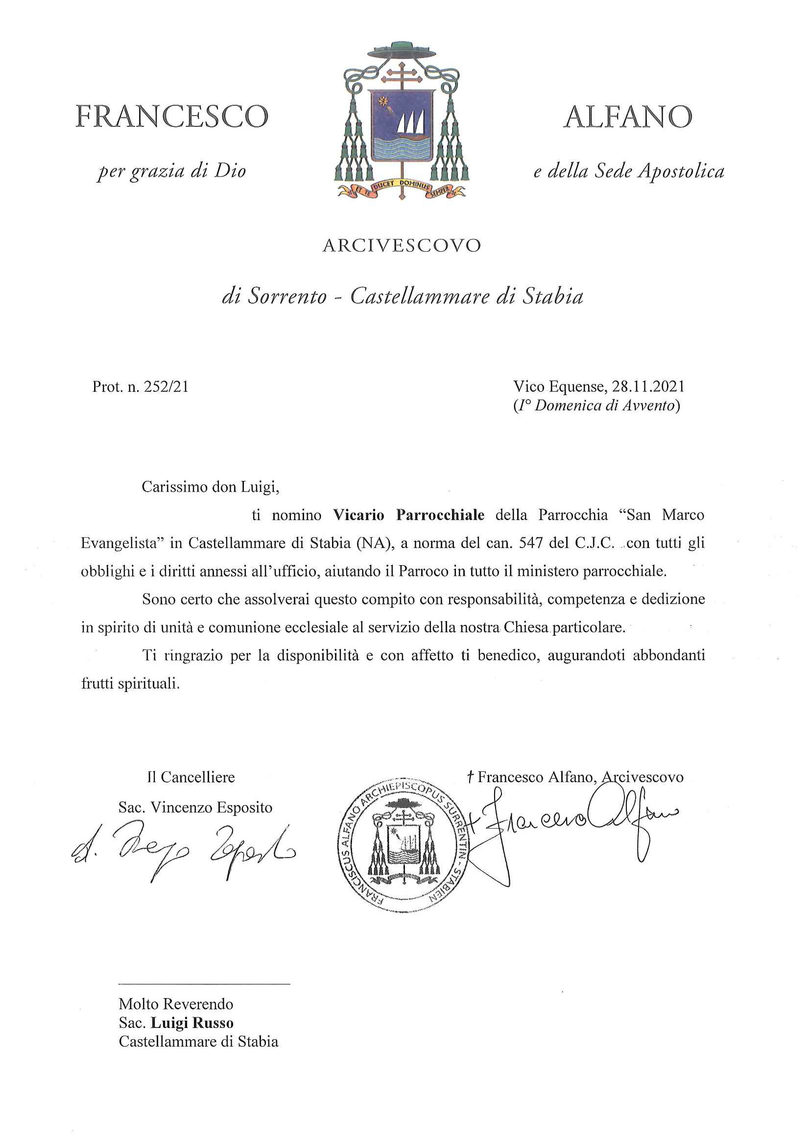 Don Luigi Russo, in data 28 novembre 2021, è stato nominato Vicario Parrocchiale della parrocchia San Marco Evangelista – Castellammare di Stabia.