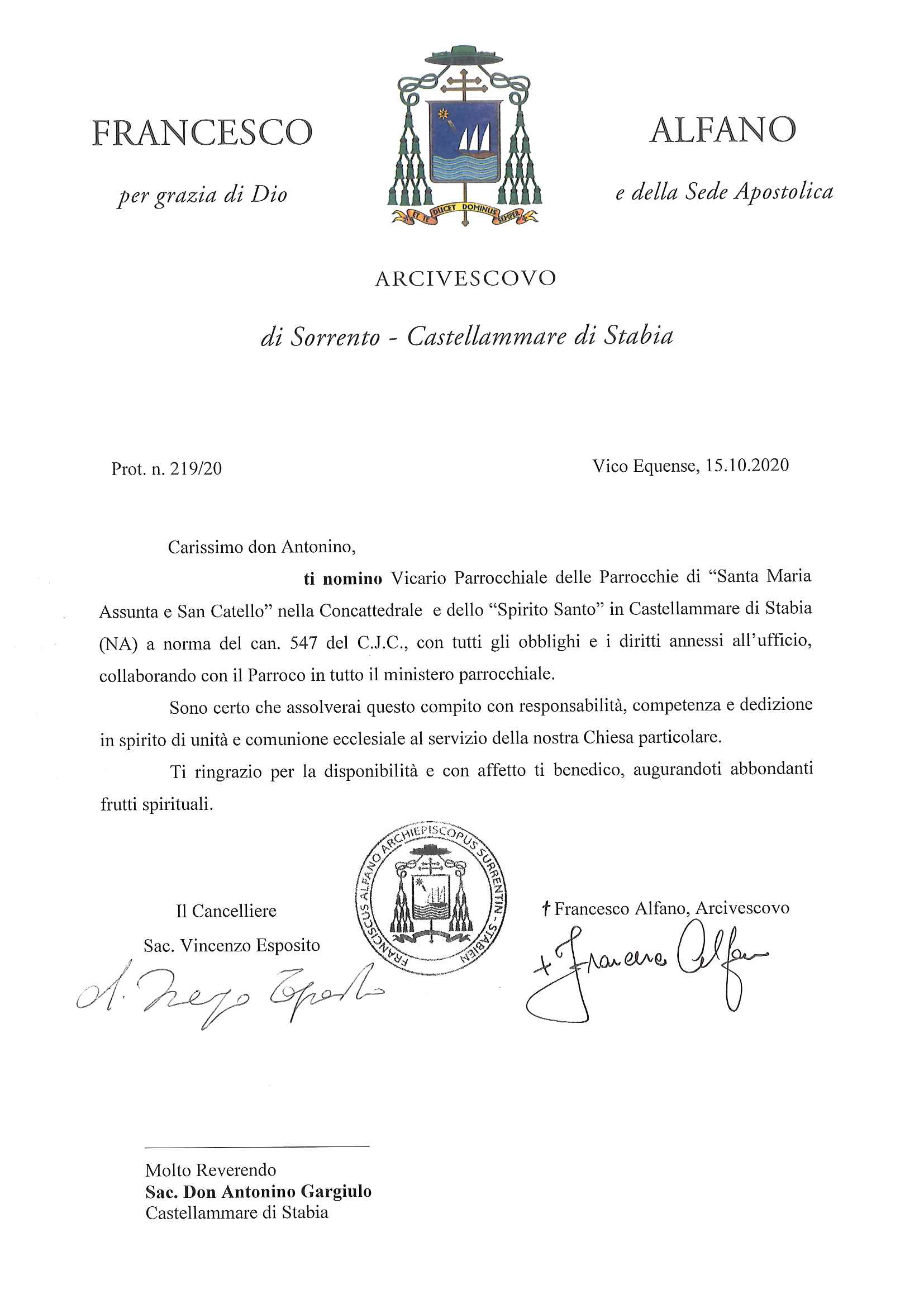 Don Antonino Gargiulo, in data 15 ottobre 2020, è stato nominato Vicario Parrocchiale delle parrocchie Santa Maria Assunta e San Catello (Concattedrale) e Spirito Santo in Castellammare di Stabia.