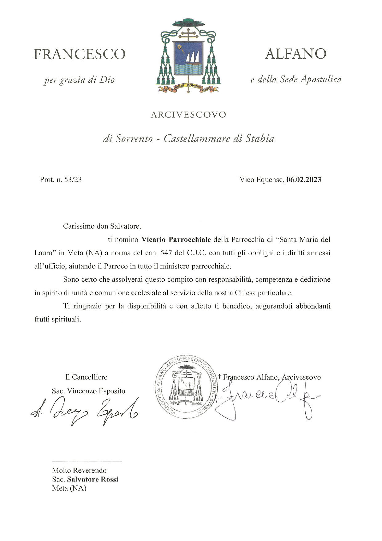Don Salvatore Rossi, in data 06 febbraio 2023, è stato nominato vicario parrocchiale della parrocchia Santa Maria del Lauro, Meta.