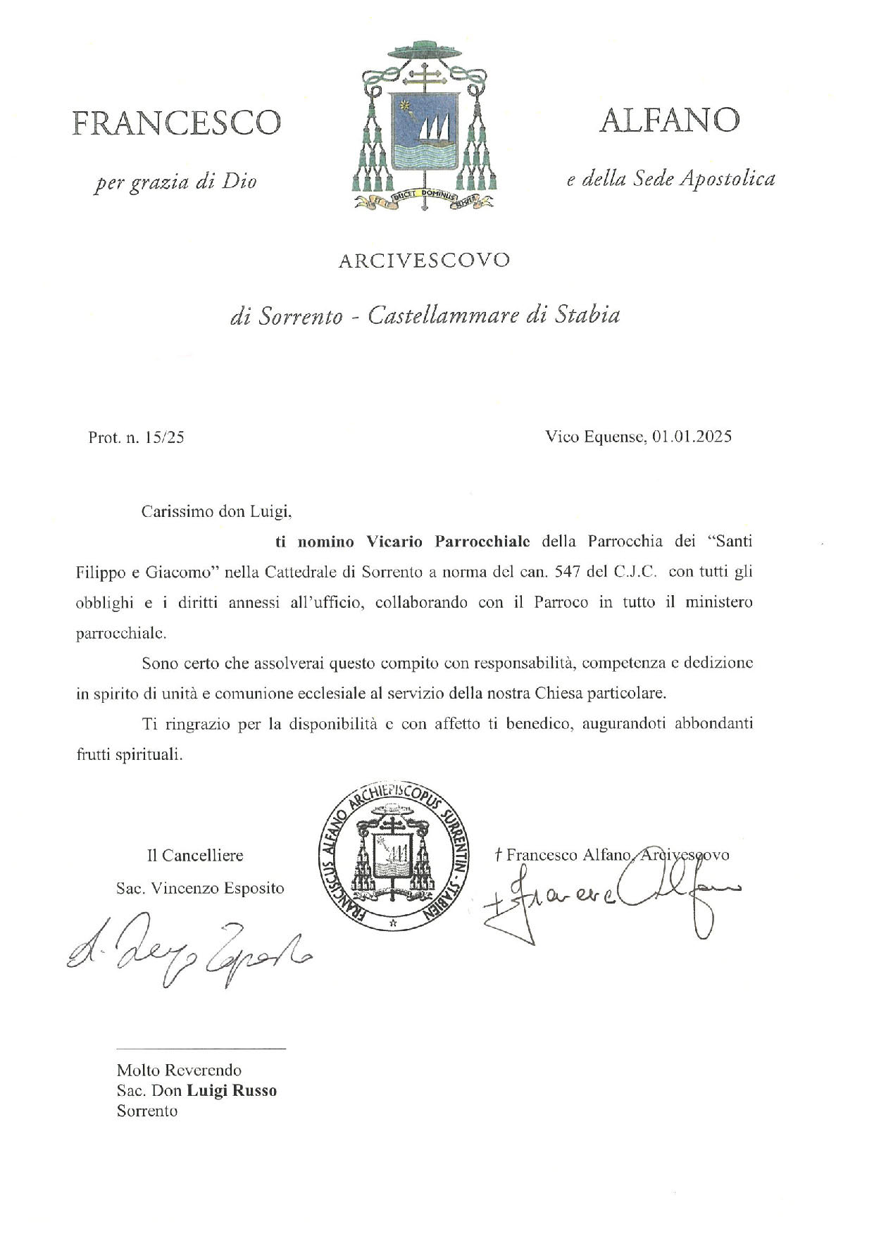 Don Luigi Russo, in data 01 gennaio 2025, è stato nominato Vicario Parrocchiale della parrocchia “Santi Filippo e Giacomo” Cattedrale in Sorrento.