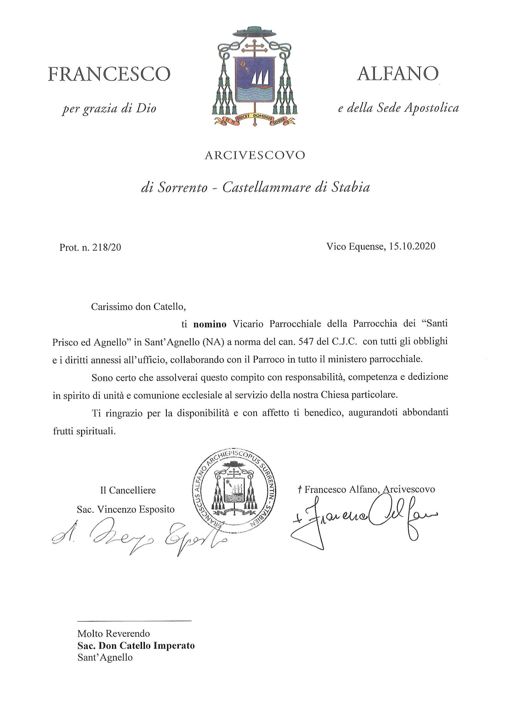 Don Catello Imperato, in data 15 ottobre 2020, è stato nominato Vicario Parrocchiale della parrocchia Santi Prisco ed Agnello, in Sant’Agnello