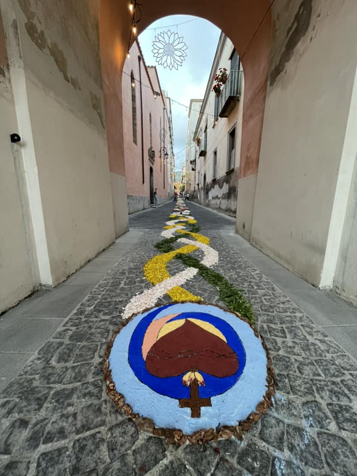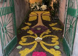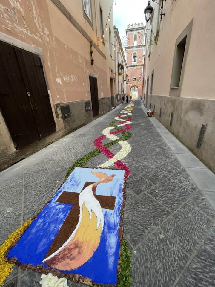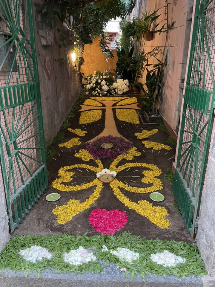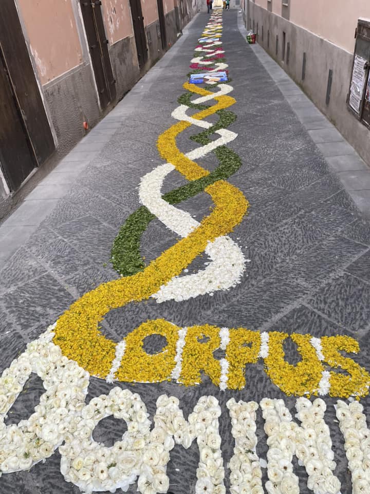 I tappeti vengono tradizionalmente realizzati con fiori partendo da un disegno base. Per i contorni, al fine di esaltare figure e geometrie, viene utilizzata torba o fondi di caffè. Il resto, è un lavoro certosino fatto di sfumature, accostamenti di colori, ricerca di chiaroscuro e profondità. Così le strade si trasformano in una galleria d’arte, un viaggio nella bellezza. Tantissimi i presenti, mossi in corteo, che hanno voluto rendere omaggio a una delle più antiche tradizioni della città.