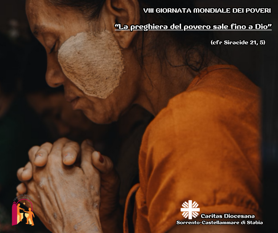 Nell’anno dedicato alla preghiera ed in prossimità del Giubileo Ordinario 2025, papa Francesco sceglie per l’VIII Giornata mondiale dei poveri l’espressione dal libro del Siracide: «La preghiera del povero sale fino a Dio» e ci invita a riflettere su questa Parola, leggendola sui volti e nelle storie che incontriamo nella nostra quotidianità, perché la preghiera diventi via di comunione con loro e condivisione della loro sofferenza.