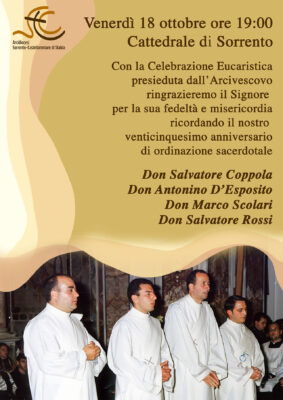 Con la Celebrazione Eucaristica presieduta dall’Arcivescovo ringrazieremo il Signore per la sua fedeltà e misericordia ricordando il nostro venticinquesimo anniversario di ordinazione sacerdotale