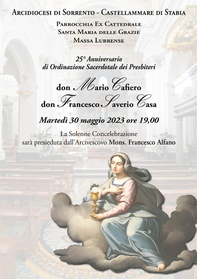19 Maggio 202325° Ordinazione Presbiterale don Mario Cafiero e don Francesco Saverio Casa martedì 30 Maggio Descrizione: 30 maggio ore 19:00 Parrocchia Santa Maria delle Grazie, Massa Lubrense Inizio: 30/05/2023 19:00 Fine: 30/05/2023 19:00 Categorie: Appuntamenti diocesani Città: Sorrento Regione: Campania Paese: Italia