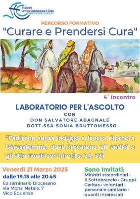 19 Marzo 2025Servizio Pastorale della Salute4° Incontro “Curare e Prendersi Cura” venerdì 21 Marzo Descrizione: ”Partirono senza indugio e fecero ritorno a Gerusalemme, dove trovarono gli undici e gli altri riuniti con loro (Lc. 24, 33) Inizio: 21/03/2025 19:15 Fine: 21/03/2025 20:45 Categorie: Appuntamenti diocesani Città: Sorrento Regione: Campania Paese: Italia