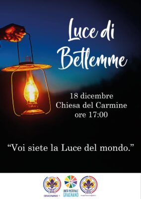 Nella Chiesa della Natività a Betlemme vi è una lampada ad olio che arde perennemente da moltissimi secoli, alimentata dall’olio donato a turno da tutte le Nazioni cristiane della Terra. A Dicembre ogni anno da quella fiamma ne vengono accese altre e  vengono diffuse su tutto il pianeta come simbolo di pace e fratellanza fra i popoli. Sabato mattina gli scout della nostra città di Gragnano saranno a Napoli per accogliere la luce, e domenica nella chiesa del Carmine vivremo un particolare momento di preghiera cittadine per la pace, per ogni guerra, e ad ognuno sarà consegnata la luce di Betlemme da far ardere nei luoghi in cui si vive.