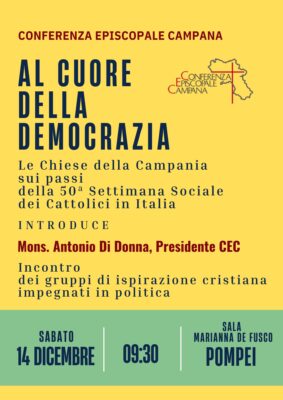La Conferenza Episcopale Campana invita i gruppi di ispirazione cristiana impegnati in politica all’incontro sul tema: “Al cuore della democrazia”, organizzato per sabato 14 dicembre 2024 alle ore 9:30 a Pompei (sala Marianna de Fusco).