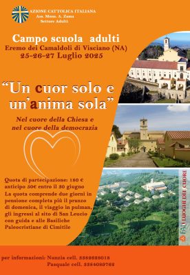 Come ogni anno, l’ azione cattolica adulti diocesana ci offre, con il campo scuola, l’occasione di vivere alcuni giorni di esperienza vissuta insieme, per essere testimoni di un cuore partecipativo nei luoghi e nei tempi della nostra vita.