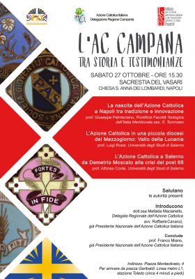 L’Azione Cattolica Italiana, la Delegazione AC Regione Campania e l’ISACEM “Paolo VI” (Istituto per la storia dell’Azione Cattolica e del Movimento Cattolico in Italia), in occasione dei 150 anni dell’AC, promuovono il Convegno storico “L’AC CAMPANA tra storia e testimonianze” – Sabato 27 Ottobre ore 15,30 – Sacrestia del Vasari – Chiesa Sant’Anna dei Lombardi – Napoli.
