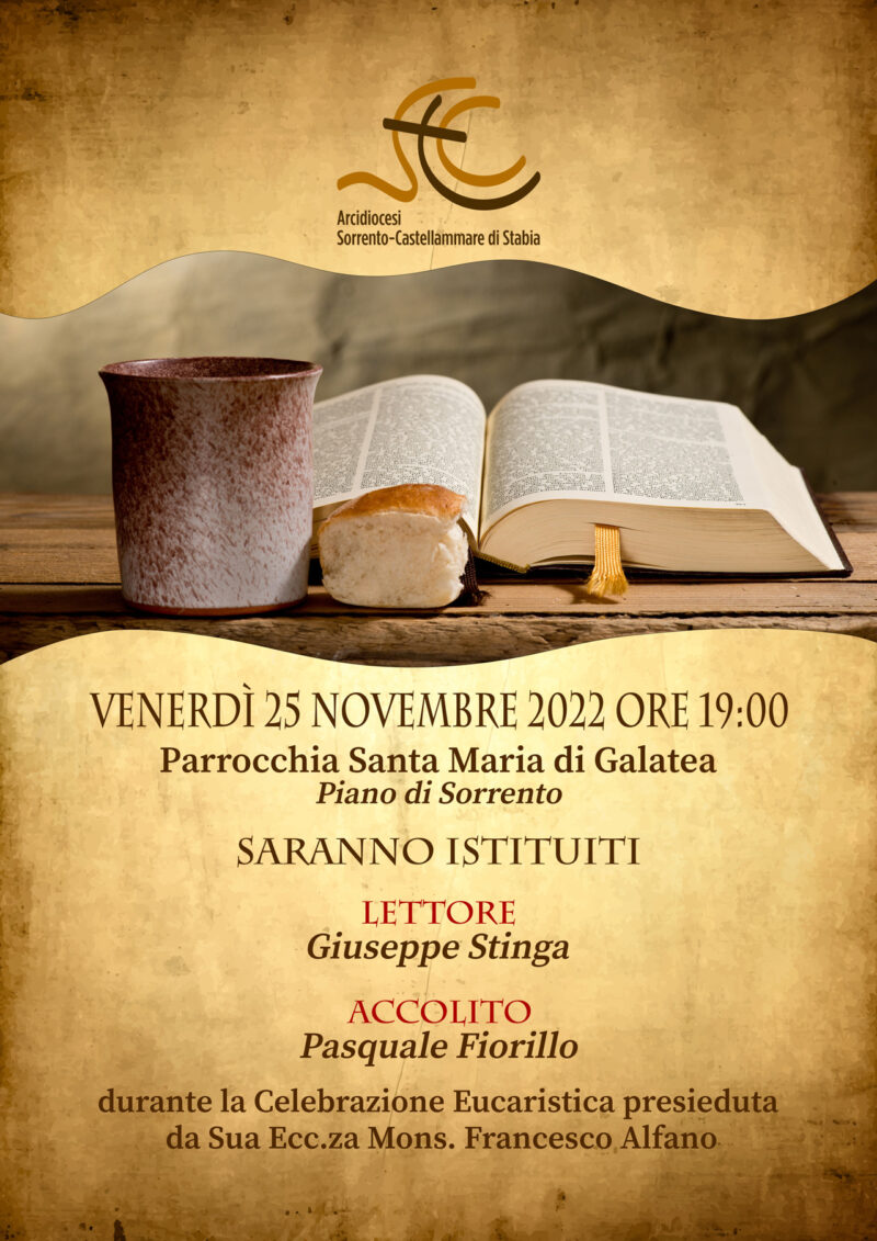 9 Novembre 2022Accolitato e Lettorato venerdì 25 Novembre Descrizione: Programma Inizio: 25/11/2022 19:00 Fine: 25/11/2022 20:30 Categorie: Appuntamenti diocesani Città: Sorrento Regione: Campania Paese: Italia