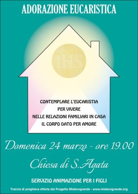 Domenica 24 marzo alle ore 19:00 nella Parrocchia di Sant’Agata vivremo un momento di adorazione rivolto innanzitutto alle coppie di sposi, ma aperto anche alle altre vocazioni e a quanti vogliano unirsi nella preghiera per il sacramento del matrimonio e per la famiglia.
