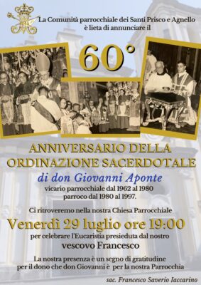 Con grande gioia vi annuncio il sessantesimo anniversario di Ordinazione presbiterale di don Giovanni Aponte, nostro parroco degli anni ’80 e ’90. Un esempio di vita donata nella quotidianità, di disponibilità e attenzione verso i più deboli, soprattutto gli ammalati (sicuramente quelli più grandi ricorderanno le volte in cui, guidando l’ambulanza dell’Ospedale Lauro, si è fatto prossimo nelle ore più difficili di tante famiglie).