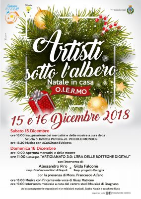 Castellammare di Stabia, 15 e 16 dicembre 2018. La Fondazione O.I.E.R.MO di Castellammare di Stabia, per le festività natalizie e per augurare un felice nuovo anno, quest’anno si mette in gioco sperimentando una nuova formula, attraverso l’evento “Artisti sotto l’albero – Natale in casa Oiermo”. La kermesse, patrocinata dal comune di Castellammare di Stabia, avrà luogo nel teatro della struttura, in Via Annunziatella 23, nei giorni 15 e 16 dicembre. Essa si presenta come un’occasione per tutti gli artisti del territorio, una vetrina per chi desidera farsi conoscere e formarsi incontrando nuove persone. Il fil rouge dei due giorni sarà l’arte e l’artigianato in tutte le sue forme. Più di venti gli stand presenti, accompagnati da diverse esposizioni. Presepisti, cake designer, ceramisti, modellisti, pittori e tanto altro ancora. Non mancheranno gli spettacoli musicali, con CatGirace&Voices, il Centro Studi Mousiké di Gragnano e Giusy Matrone. Il taglio del nastro è previsto per le ore 16:00 del giorno 15 dicembre, a farci compagnia, la Scuola d’Infanzia Paritaria Il Piccolo Mondo. Il giorno 16 dicembre, di mattina, si terrà l’incontro formativo a cura del progetto Escogita “Artigianato 3.0: l’era delle botteghe digitali” con la presenza del Vescovo Mons. Francesco Alfano. Ad accompagnare le esposizioni e le esibizioni musicali, Babbo Natale il suo elfo e lo zucchero filato. L’ingresso all’evento è gratuito. Di seguito il programma dettagliato: