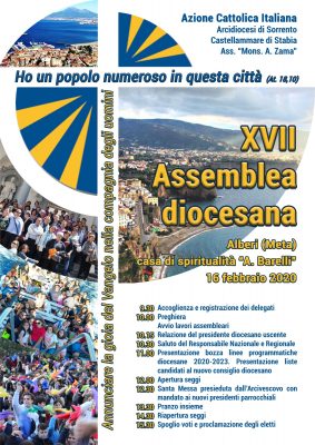 L’ Assemblea elettiva eleggerà il nuovo Consiglio diocesano ed approverà le linee programmatiche per il prossimo triennio. Oltre alla relazione del presidente uscente Gianfranco Aprea, vi sarà il saluto di un Responsabile Nazionale e Regionale. L’Arcivescovo sarà presente durante l’intera giornata e celebrerà l’Eucarestia nella Cappella della Casa. Durante la celebrazione consegnerà il mandato ai nuovi presidenti parrocchiali. L’Assemblea si concluderà con il pranzo comunitario per vivere un momento di fraternità.