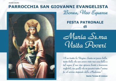 Anche quest’anno, in collaborazione con la Confraternita del SS.Rosario di Bonea e con il comitato festa, torna la nostra festa parrocchiale in onore di Maria Visita Poveri. A seguito delle attuali norme vigenti dovute alla pandemia vivremo i giorni che vanno dal 6 al 15 agosto in modo diverso.