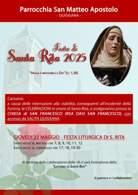A causa delle interruzioni alla viabilità, conseguenti all’incidente della Funivia, le celebrazioni in onore di Santa Rita, si svolgeranno presso la Chiesa di San Francesco (RSA Oasi San Francesco), con accesso da salita Quisisana.