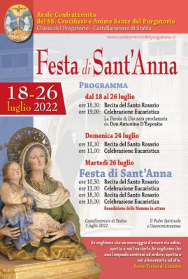 27 Giugno 202227 Giugno 2022Chiesa del Purgatorio: arriva la Festa di Sant’Anna lunedì 18 Luglio Descrizione: La chiesa del Santissimo Crocifisso e Anime del Purgatorio festeggia Sant’Annna dal 18 al 26 luglio. Inizio: 18/07/2022 09:00 Fine: 26/07/2022 22:00 Categorie: Appuntamenti parrocchiali Città: Sorrento Regione: Campania Paese: Italia