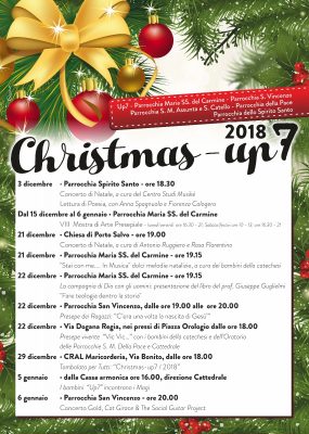 L’Unità Pastorale 7, che raggruppa le parrocchie del Centro Antico di Castellammare di Stabia: Carmine, Cattedrale, S. Vincenzo, Spirito Santo e Pace, da diversi anni propone in estate una bella esperienza di conoscenza ed amicizia tra le nostre comunità, offrendo ed animando serate di musica, spettacoli, canzoni. Sollecitati dalle comunità che rappresentiamo, quest’anno abbiamo fatto un passo in più: è nato così il cartellone Christmas-UP7 2018, che indica in maniera unitaria gli eventi natalizi che le nostre parrocchie propongono, e che offriamo all’attenzione di quanti, nelle nostre comunità e non solo, vogliono passare qualche ora in compagnia, in amicizia e semplicità.