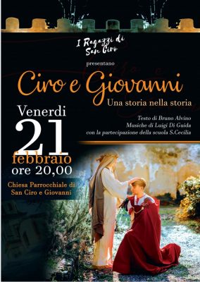 Una forma tradizionale di musical, cioè una narrazione teatrale interamente accompagnata dalla musica, vi aspetterà tutti venerdì 21 febbraio ore 20 nella chiesa parrocchiale dei Santi Ciro e Giovanni, grazie ai ragazzi dell’ACG, gli educatori della Parrocchia, i sacerdoti don Ciro e don Gianluigi, il testo del regista Bruno Alvino e la figlia Angela, le Musiche di Luigi Di Guida e la partecipazione dei ragazzi della scuola di musica Santa Cecilia.
