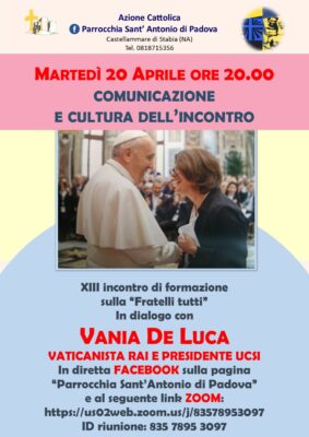 Il percorso di formazione dell’Azione Cattolica della Parrocchia S. Antonio di Padova dedicato all’Enciclica “Fratelli Tutti” (FT) è arrivato al tredicesimo incontro, approfondendo il tema della “Comunicazione e cultura dell’incontro”. Martedì 20 Aprile 2021 alle ore 20.00 incontreremo e dialogheremo con Vania De Luca, Vaticanista Rai e Presidente UCSI. Focus: la comunicazione nella Fratelli tutti e nel progresso del magistero dei Papi! Il Santo Padre offre nell’Enciclica dei preziosi suggerimenti per una comunicazione che tenga conto e ricerchi la verità e che miri all’incontro tra le persone!
