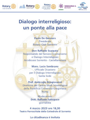 2 Marzo 2023Dialogo interreligioso: un ponte alla pace sabato 4 Marzo Descrizione: Programma in locandina Inizio: 04/03/2023 18:30 Fine: 04/03/2023 20:00 Categorie: Appuntamenti diocesani Città: Sorrento Regione: Campania Paese: Italia