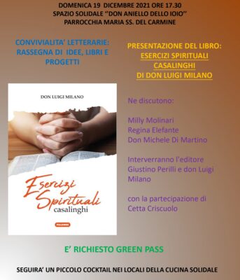 Domenica 19 dicembre 2021 ore 17.30, presso lo spazio solidale ‘’Don Aniello dello Ioio’’ – Parrocchia Maria ss. del Carmine, sarà presentato “Esercizi spirituali casalinghi”, di Don Luigi Milano. L’evento rientra nel programma “Convivialità letterarie”, rassegna di idee, libri e progetti.