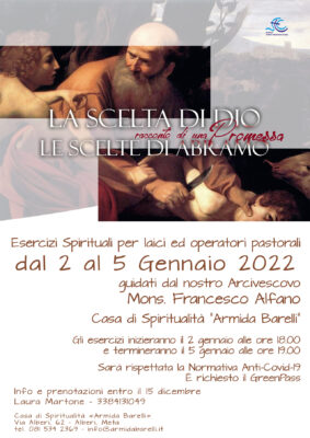 da domenica 2 a mercoledì 5 gennaio 2022, come di consuetudine per la nostra Diocesi, l’Arcivescovo terrà gli Esercizi Spirituali, a cui sono invitati soprattutto i laici e gli operatori pastorali.