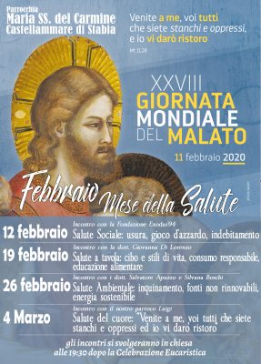 La Giornata Mondiale del Malato, che si celebra ogni anno l’11 febbraio, rappresenta una occasione per parlare di salute e malattia, ponendo al centro l’uomo, col suo bisogno di cura e pienezza di vita. Sappiamo che la salute non è solo la mancanza di malattia, ma è molto di più: è presenza di benessere a livello fisico, psichico, sociale, ambientale, spirituale. Su questi temi la nostra comunità parrocchiale è invitata a riflettere, con l’aiuto di esperti, attraverso gli incontri che proponiamo secondo il presente calendario: