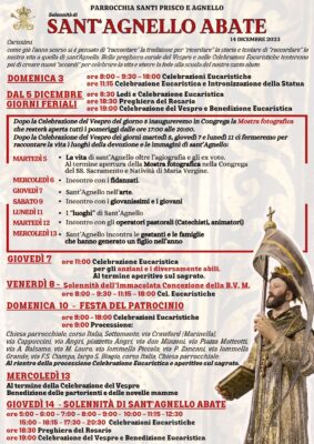 30 Novembre 2023Festa di Sant’Agnello giovedì 14 Dicembre Descrizione: programma Inizio: 14/12/2023 00:00 Fine: 14/12/2023 23:00 Categorie: Appuntamenti parrocchiali Città: Sorrento Regione: Campania Paese: Italia