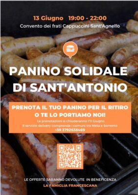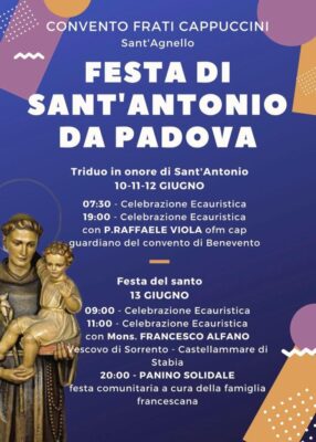 7 Giugno 2021Festa di Sant’Antonio con il Panino Solidale ai Cappuccini Sant’Agnello domenica 13 Giugno Descrizione: Data: 13/06/2021 (tutto il giorno) Categorie: Appuntamenti parrocchiali Città: Sorrento Regione: Campania Paese: Italia