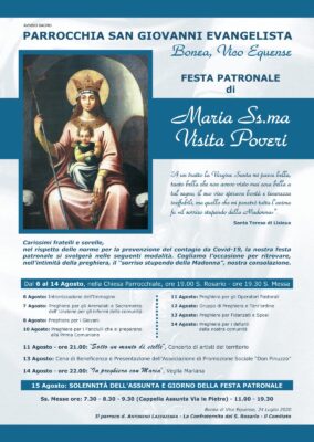 Anche quest’anno, in collaborazione con la Confraternita del SS. Rosario di Bonea e con il comitato festa, torna la nostra festa parrocchiale in onore di Maria Visita Poveri. A seguito delle attuali norme vigenti dovute alla pandemia vivremo i giorni che vanno dal 6 al 15 agosto in modo diverso. Non potremmo accompagnare la nostra dolce Madre benedicente lungo le strade della nostra comunità a portare forza e consolazioni nelle nostre case, ma saremo noi suoi figli ad andare da lei, per trovare rifugio sotto la sua protezione. Alle ore 19.00 la preghiera del santo rosario e a seguire alle 19.30 la santa messa presieduta da diversi sacerdoti della nostra diocesi. Così è stato pensato questo percorso spirituale che vuole ogni giorno pregare per una realtà particolare della nostra famiglia parrocchiale. Dopo l’intronizzazione del 6 agosto che riserva una grande sorpresa, il 7 affideremo alla nostra Madre tutti gli ammalati; il giorno 8 i ragazzi e i giovani, il 10 i fanciulli che si preparano all’incontro con Gesù nell’Eucarestia; l’11 invocheremo la sua intercessione per tutti gli operatori pastorali, il 12 ci aiuteranno nella preghiera tutti i gruppi del RnS, il Terz’Ordine Minimo e il gruppo Mariano; il 13 chiederemo una effusione di grazia su tutte le coppie di sposi e di fidanzati. Concluderemo il 14 pregando per tutti i nostri cari defunti.