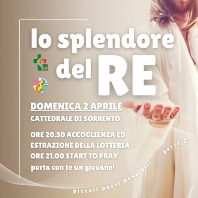 Domenica 2 aprile, ore 20.30, all’inizio della Settimana Santa, ci attende un altro piccolo passo possibile da compiere: ci incontreremo a Sorrento, nella nostra Chiesa Cattedrale, per vivere come famiglia diocesana un momento di preghiera, in adorazione, per contemplare e farci illuminare dallo “splendore del Re”. Cogli il momento e fa’ entrare nella tua vita la luce che spazza via le tenebre della paura e dello sconforto. Se desideri che un amico, un’amica (anche se non partecipa alla Gmg), viva la tua stessa esperienza, invitalo: questo è il momento giusto!