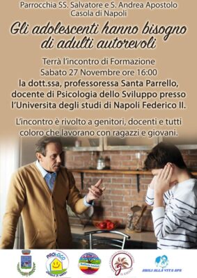 Abbiamo bisogno di esperienza e formazione, proprio per questo motivo vi invito sabato 27 Novembre alle ore 16:00 nella parrocchia Ss.Salvatore e S.Andrea Apostolo. Terrà la formazione la dott.ssa, professoressa Santa Parrello docente di Psicologia dello sviluppo, presso l’università di Napoli Federico II.