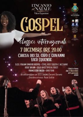 A Vico Equense il Natale si festeggia al ritmo di gospel, con il concerto di Josie Taylor. L’appuntamento è per sabato prossimo, 7 dicembre 2019, alle ore 20.00, nella Chiesa parrocchiale dei Santi Ciro e Giovanni.