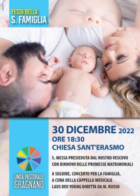 Venerdì 30 dicembre, ore 18:30, presso la Chiesa di Sant’Erasmo a Gragnano, in occasione della Festa della Famiglia, sarà celebrata la messa da Mons. Alfano con il rinnovo delle promesse matrimoniali.