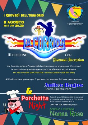 Continuano i Giovedì dell’Oratorio Visita ai Poveri della Parrocchia San Giovanni Evangelista di Bonea di Vico Equense con la terza imperdibile edizione della Corrida, giovedì 8 agosto 2019 ore 20.30. Aperte le iscrizioni per questo magnifico evento gratuito ed aperto a tutti.