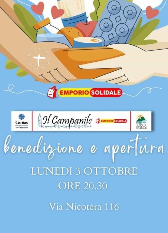 Lunedì 3 ottobre, alle ore 20.30, con la benedizione del nostro Arcivescovo Mons. Francesco Alfano, aprirà anche a Vico Equense in via Nicotera 116 (nei pressi della salita di Santa Maria del Toro) un emporio solidale per aiutare le persone in difficoltà economica. L’iniziativa voluta dalla Caritas Interparrocchiale delle Parrocchie vicane, rientra tra le attività della costituenda associazione Aequa Solidale ODV, rappresentata dal Parroco dei Santi Ciro e Giovanni don Ciro Esposito e che riunisce tutte le Parrocchie del territorio. La povertà aumenta insieme ai prezzi dei beni di prima necessità. Venire incontro ai bisogni della gente, è questo l’obiettivo della neonata associazione che oltre ai Parroci è aperta a tutti e chi si iscriverà potrà prendere parte ai tavoli di lavoro con nuove proposte da mettere in campo.