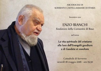 sostenuti dalla gioia della Pasqua e in attesa dello Spirito, come chiesa diocesana riceviamo un dono che ritengo essere una vera occasione di grazia: venerdì 18 maggio Enzo Bianchi, fondatore della comunità di Bose, dedicherà alla nostra Chiesa diocesana parte del suo tempo e soprattutto vorrà offrirci spunti di riflessione a partire dalla sua esperienza spirituale e dalla sua profonda conoscenza della Parola.