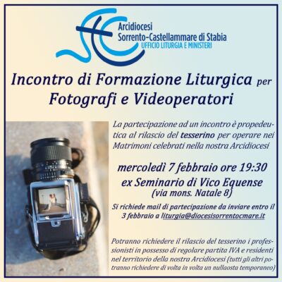 Incontro formativo destinato a fotografi e videoperatori, che, residenti ed operanti nel territorio della nostra Diocesi, desiderano richiedere il tesserino necessario per le celebrazioni di matrimonio.