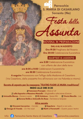 29 Luglio 2024La Festa dell’Assunta nella parrocchia di Santa Maria di Casarlano martedì 6 Agosto Descrizione: La Parrocchia Santa Maria di Casarlano (Sorrento), è pronta per la Festa dell’Assunta. Inizio: 06/08/2024 00:00 Fine: 15/08/2024 00:00 Categorie: Appuntamenti parrocchiali Città: Sorrento Regione: Campania Paese: Italia