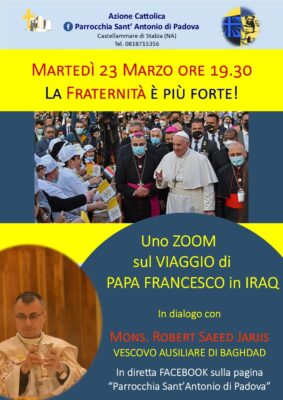Il percorso di formazione dell’Azione Cattolica della Parrocchia Sant’Antonio di Padova dedicato all’Enciclica “Fratelli Tutti” (FT) è arrivato al nono incontro, approfondendo il II Capitolo dell’Enciclica e sviluppando il tema del “Vangelo della Prossimità”. Martedì 23 Marzo 2021 alle ore 19.30 incontreremo e dialogheremo con Mons. Robert Saeed Jarjis, Vescovo Ausiliare di Baghdad. Focus: il Viaggio Apostolico di Papa Francesco in Iraq e la sua importanza storica! Il Santo Padre ha incarnato i propositi e i suggerimenti indicati nell’Enciclica in questo storico viaggio, facendosi Prossimo ad un popolo sofferente e in cammino verso la riconciliazione.
