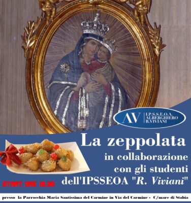 Gli studenti dell’IPSSEOA “R. Viviani” di C\mare di Stabia sono lieti di invitare i cittadini presso la Parrocchia Maria Santissima del Carmine, in Via del Carmine nel cuore di Castellammare di Stabia. L’appuntamento è per mercoledì 7 dicembre alle ore 18.30 per degustare le zeppole dell’Immacolata, dolce tipico della tradizione stabiese, rigorosamente preparate dagli studenti.