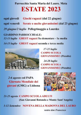 17 Luglio 2023L’estate della Parrocchia di Santa Maria del Lauro lunedì 17 Luglio Descrizione: Parrocchia Santa Maria del Lauro, estate 2023 Inizio: 17/07/2023 00:00 Fine: 12/09/2023 00:00 Categorie: Appuntamenti parrocchiali Città: Sorrento Regione: Campania Paese: Italia