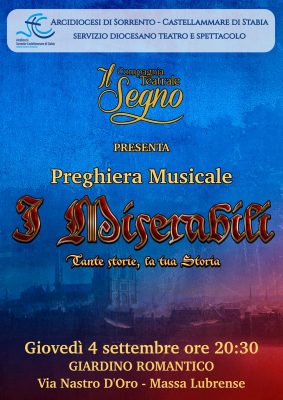 La Compagnia Teatrale “Il Segno”, in collaborazione con l’Arcidiocesi Sorrento – Castellammare di Stabia, quest’anno porterà in scena (sarà un grande ritorno) il musical “𝐈 𝐌𝐢𝐬𝐞𝐫𝐚𝐛𝐢𝐥𝐢. 𝐓𝐚𝐧𝐭𝐞 𝐬𝐭𝐨𝐫𝐢𝐞, 𝐥𝐚 𝐭𝐮𝐚 𝐬𝐭𝐨𝐫𝐢𝐚”.