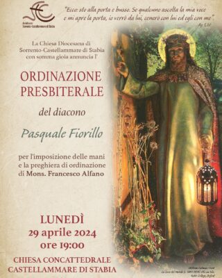 4 Marzo 202411 Marzo 2024Ordinazione presbiterale di Pasquale Fiorillo lunedì 29 Aprile Descrizione: Inizio: 29/04/2024 18:00 Fine: 29/04/2024 20:00 Categorie: Appuntamenti diocesani Città: Sorrento Regione: Campania Paese: Italia